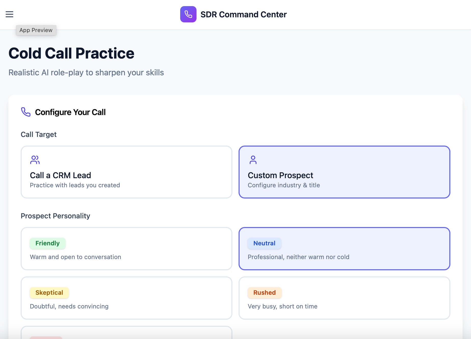 SDR Command Center was built to solve a critical gap for aspiring Sales Development Representatives: the lack of real-world, hands-on practice before landing their first sales job. Most aspiring SDRs can read scripts or watch tutorials, but there wasn’t a platform that let them practice AI-driven cold calls, manage leads in a simulated CRM, and receive actionable feedback in a safe environment.